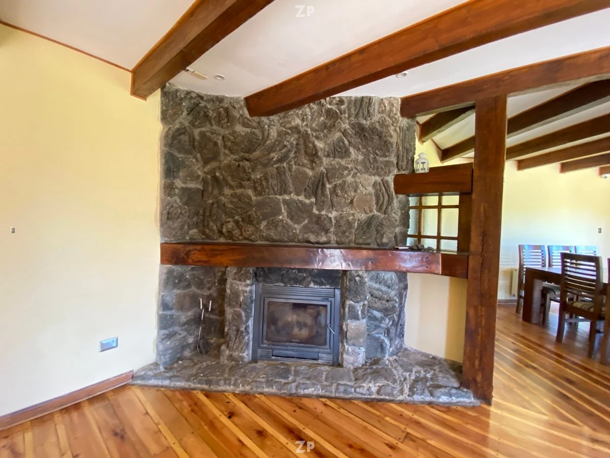 Amplio Living comedor con piso de madera y gran combustión lenta empotrada en chimenea piedra volcánica. Hermosa vista a jardines.