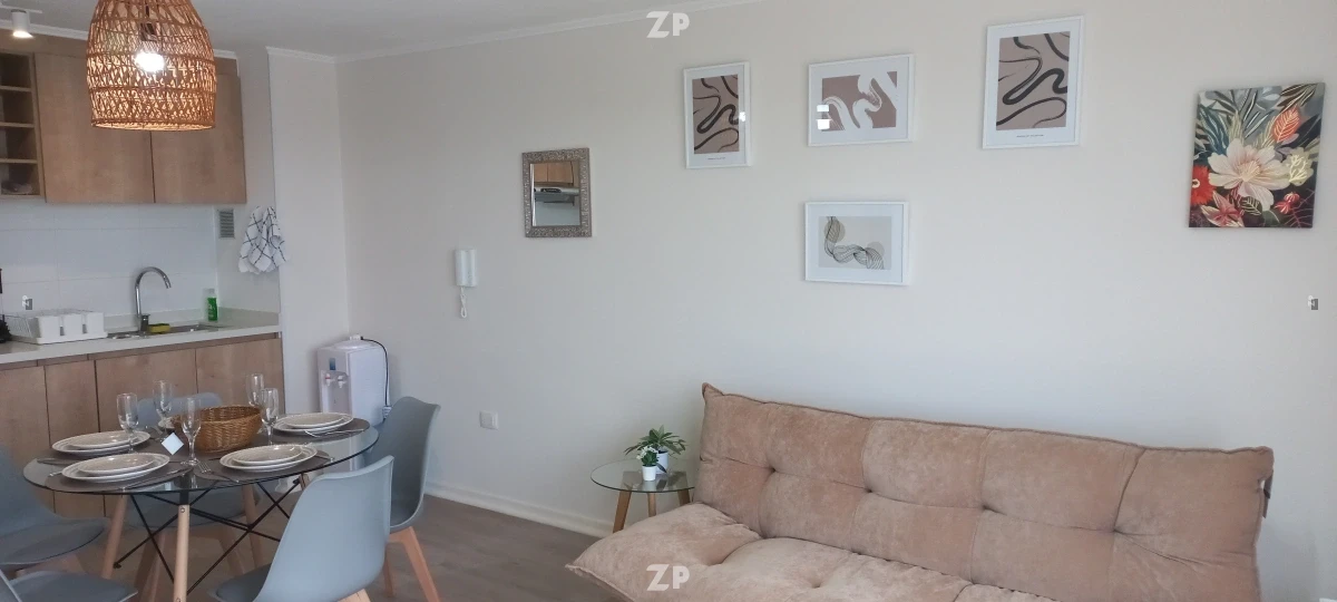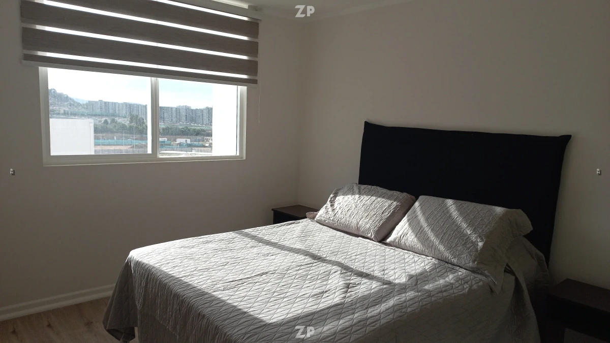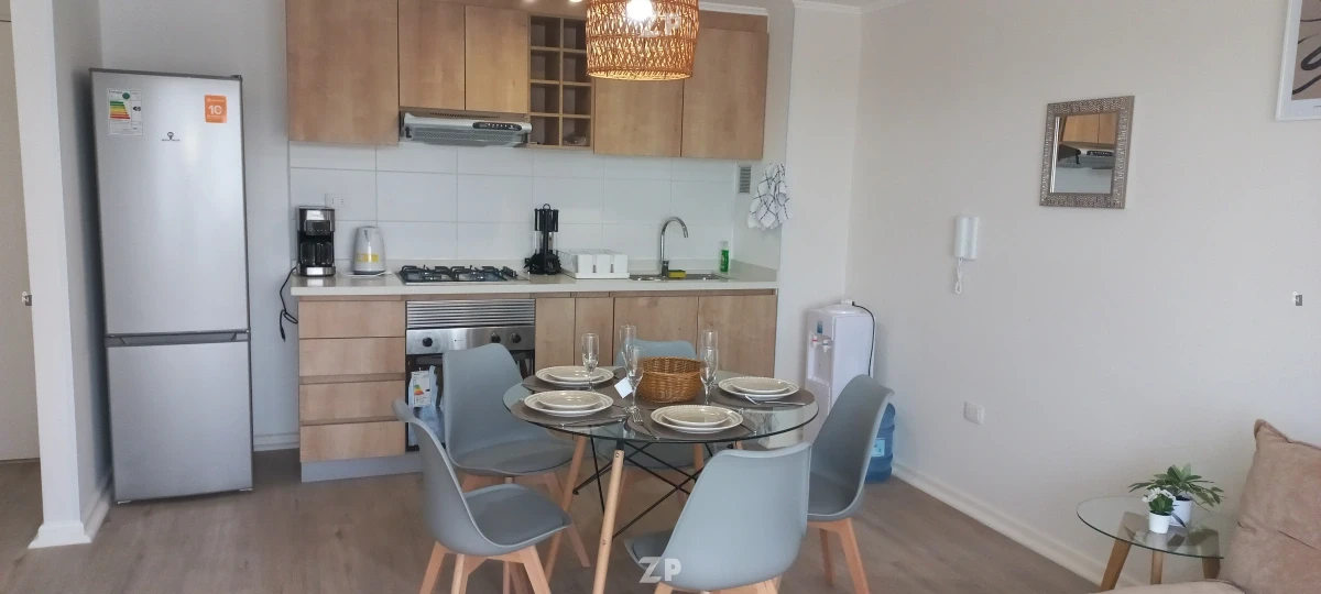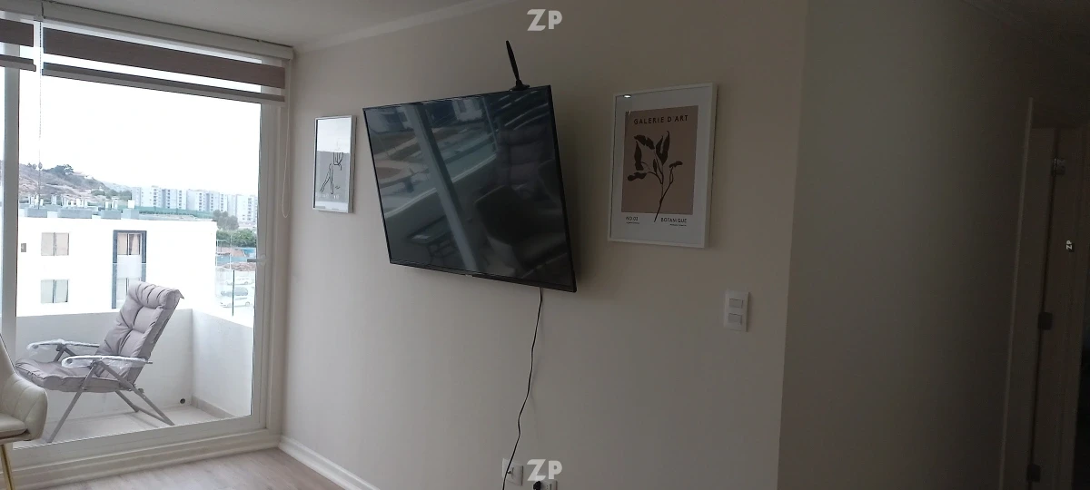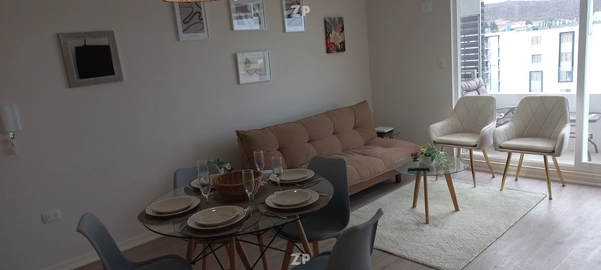 Departamento completamente amoblado en piso 6 con excelente vista y luminosidad, ubicado en Condominio Mirador de Peñuelas II, sector residencial tranquilo cercano a la playa, supermercados y locomoción.