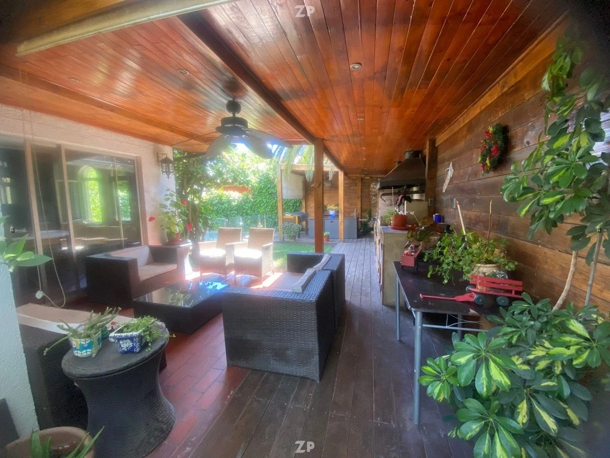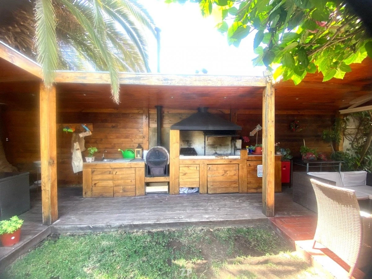 Patio amplio cuenta con estacionamiento para dos vehículos grandes, bodega, piscina y quincho.