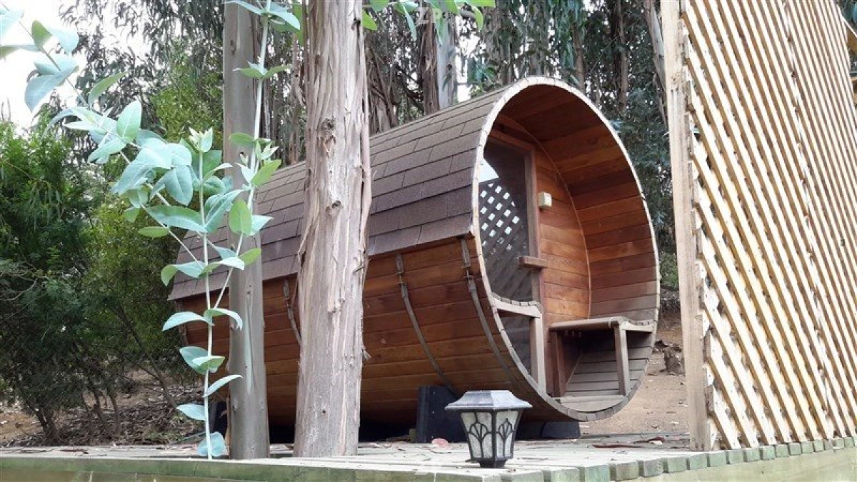 Gran jardín con riego automático, árboles frutales, fogón y sauna para 4 personas.